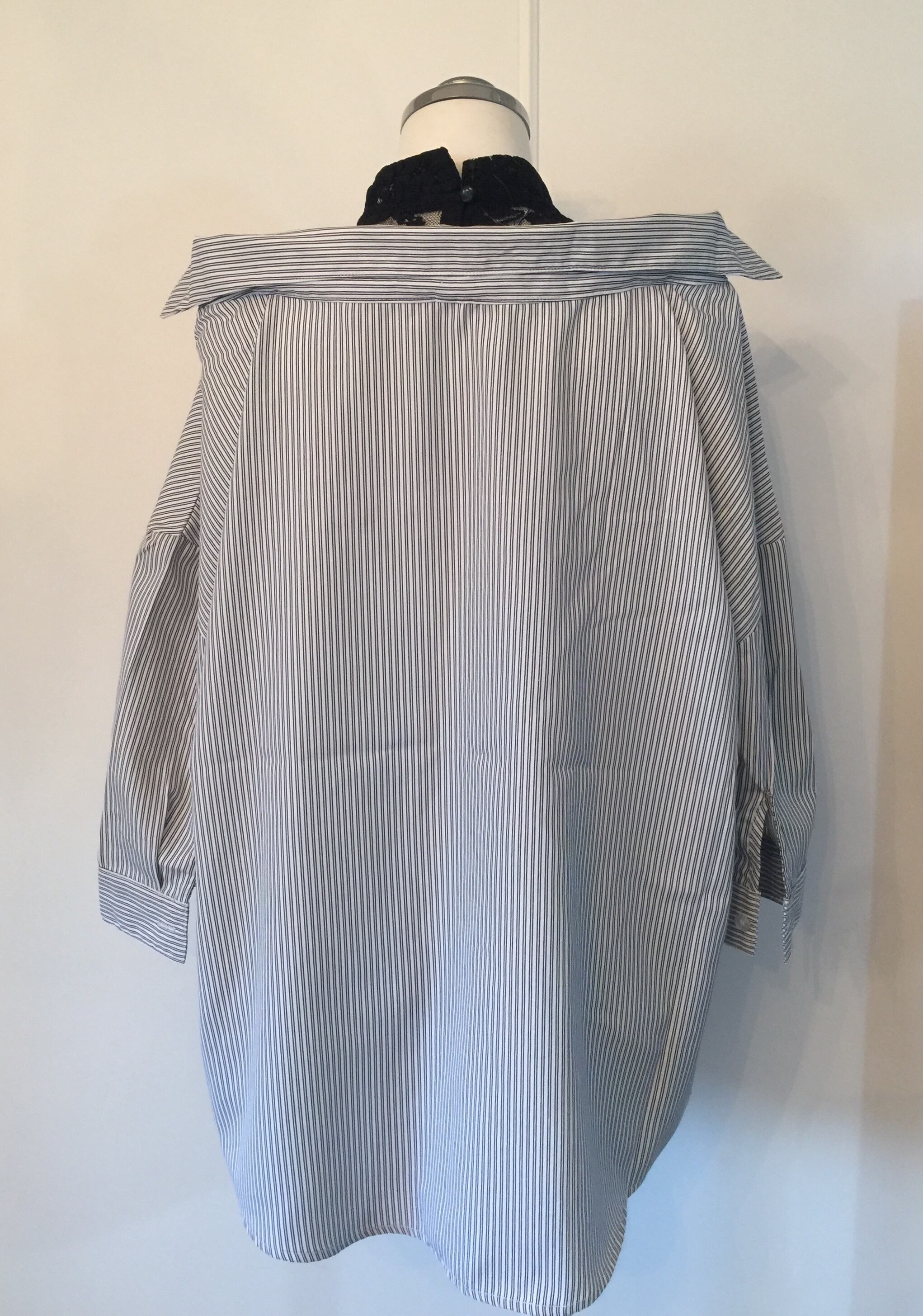 セクシーなデコルテ部分の黒レースと柔らかな縦ストライプシャツのコンビネーションがとってもクールでオシャレなデザインです。