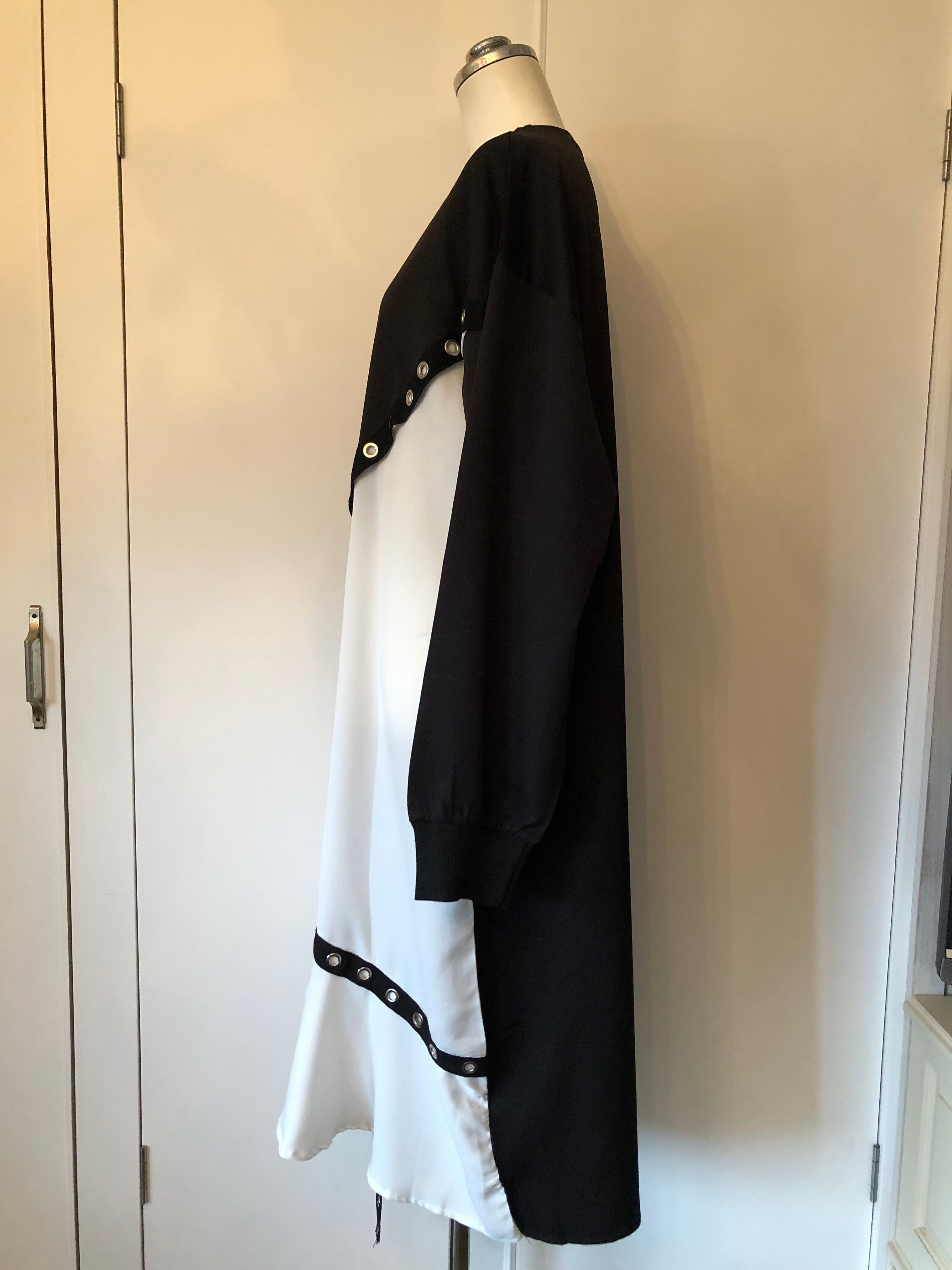 スタイリッシュなデザインとシルバーリング金具がポイントのワンピースはさらっとしていて着心地も抜群です。