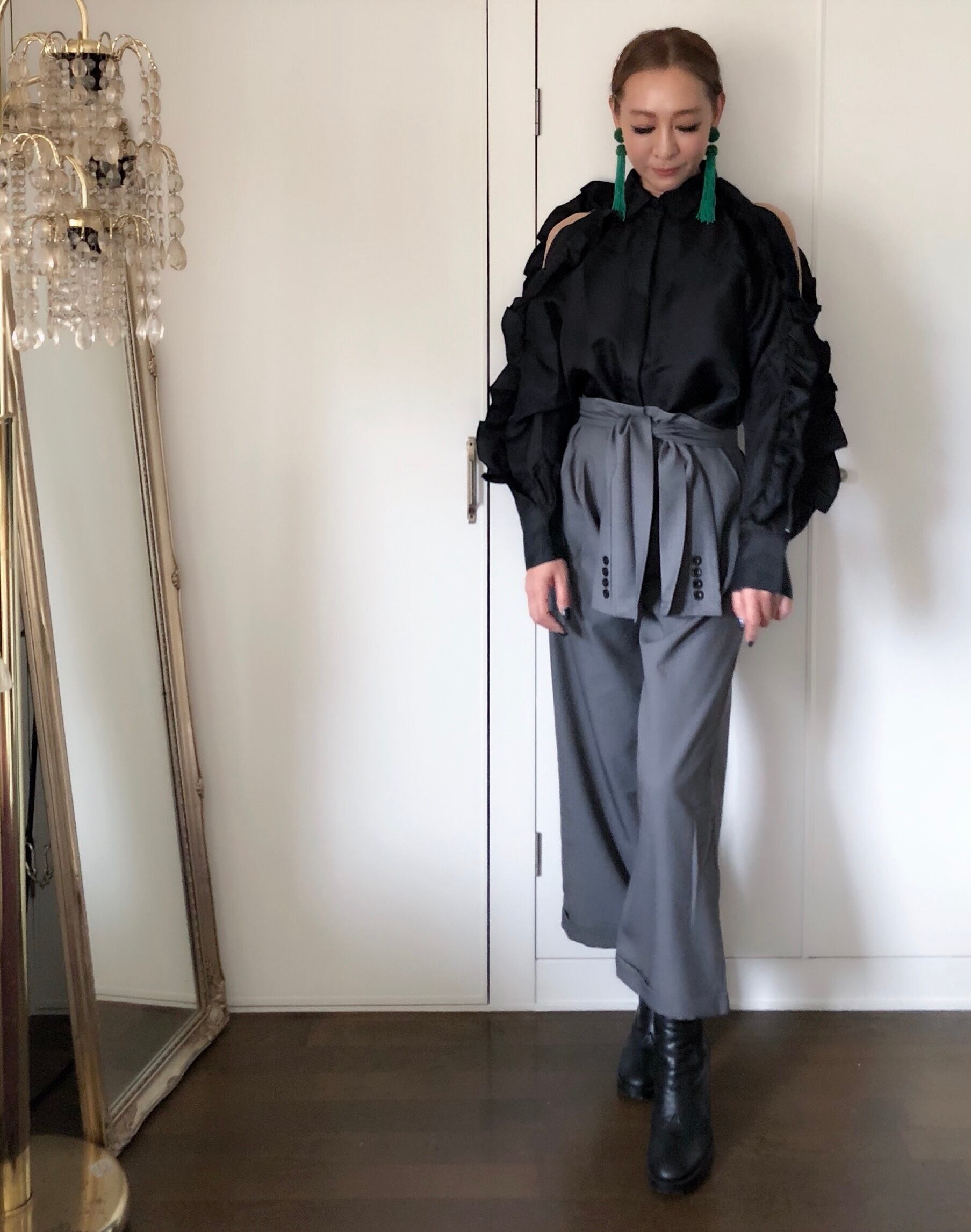 ボリュームたっぷりのフリルと肩から袖口にかけてのファスナーがユニークなブラウスです。