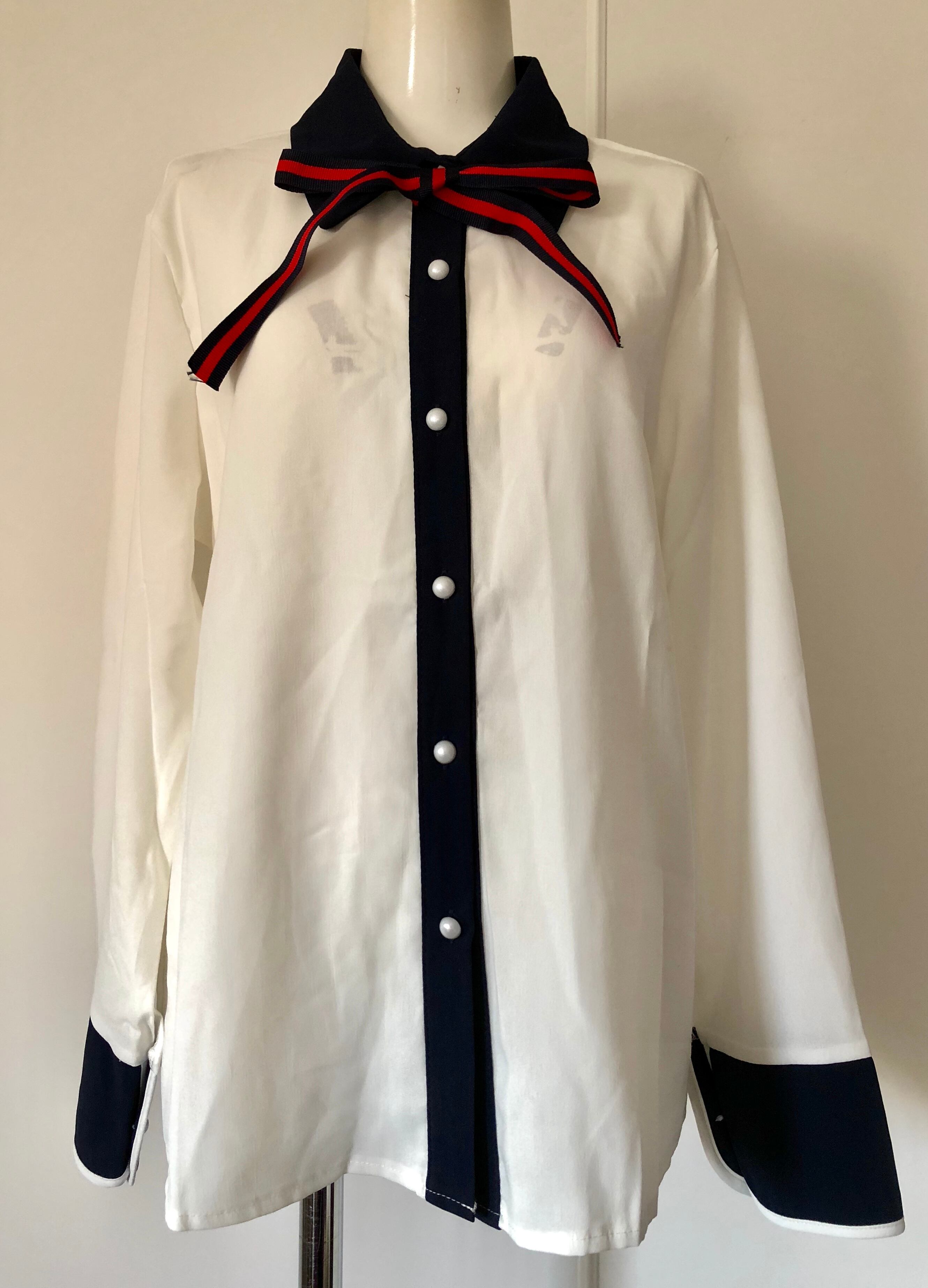清楚な色合いのさらさらブラウスは付属の暇をリボンで縛ります。