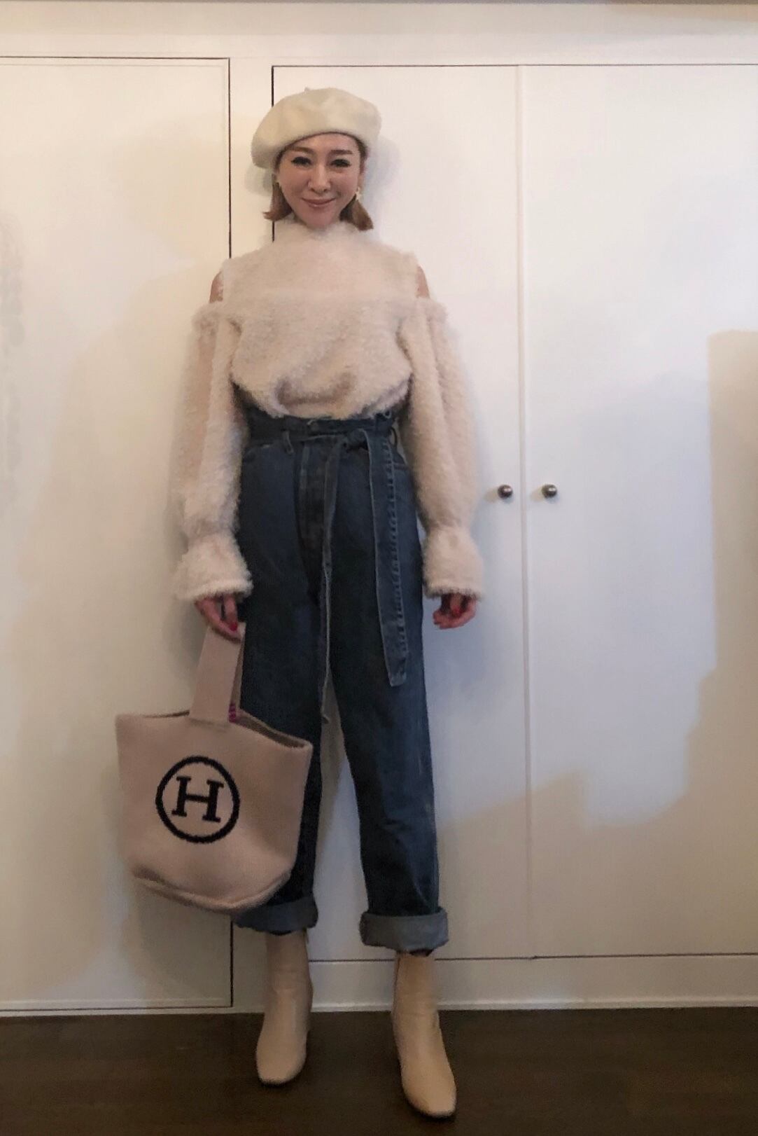 肩先が少し見えるモコモコトップスは可愛さ抜群!
