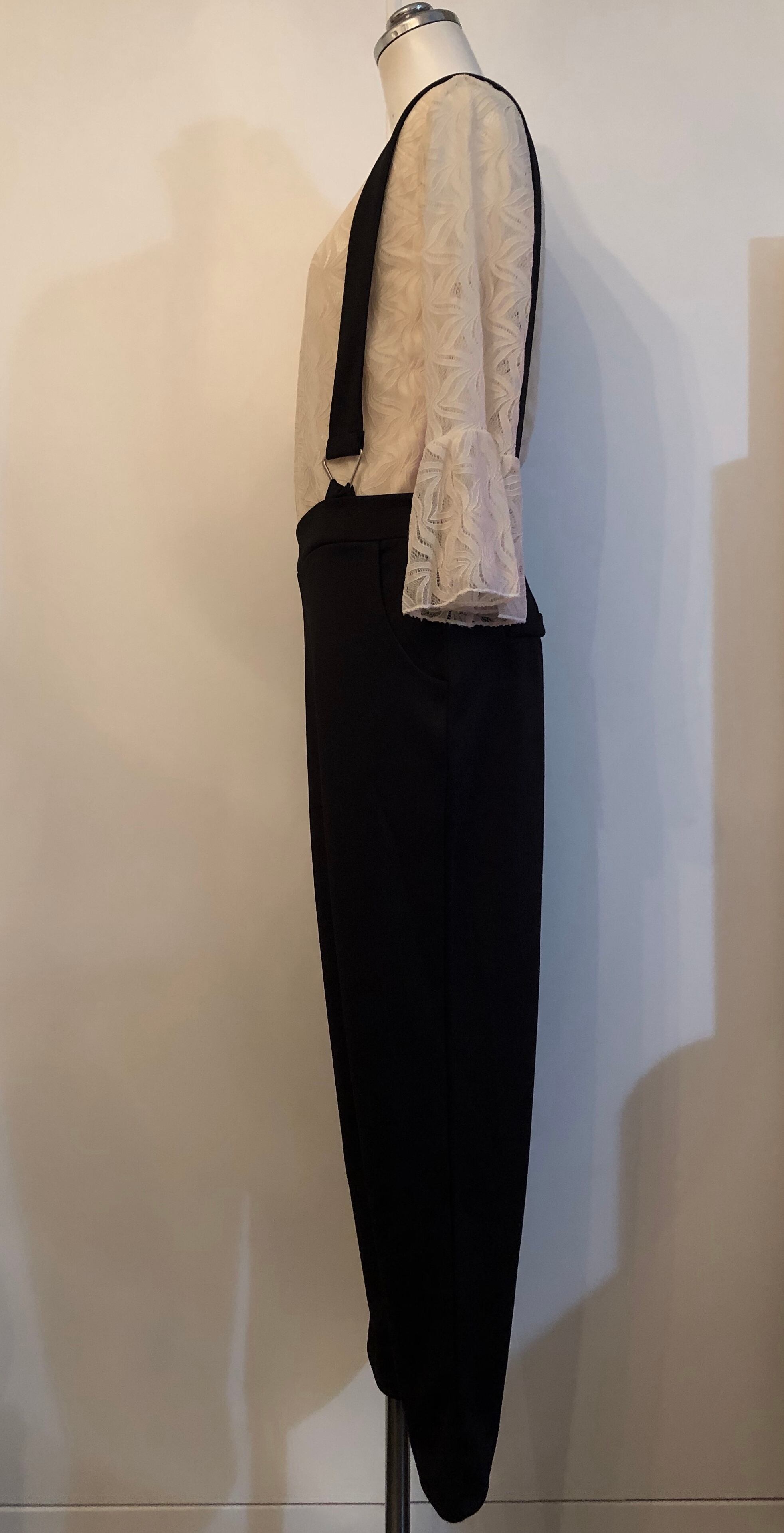 薄手のボンディング生地のサスペンダーパンツの