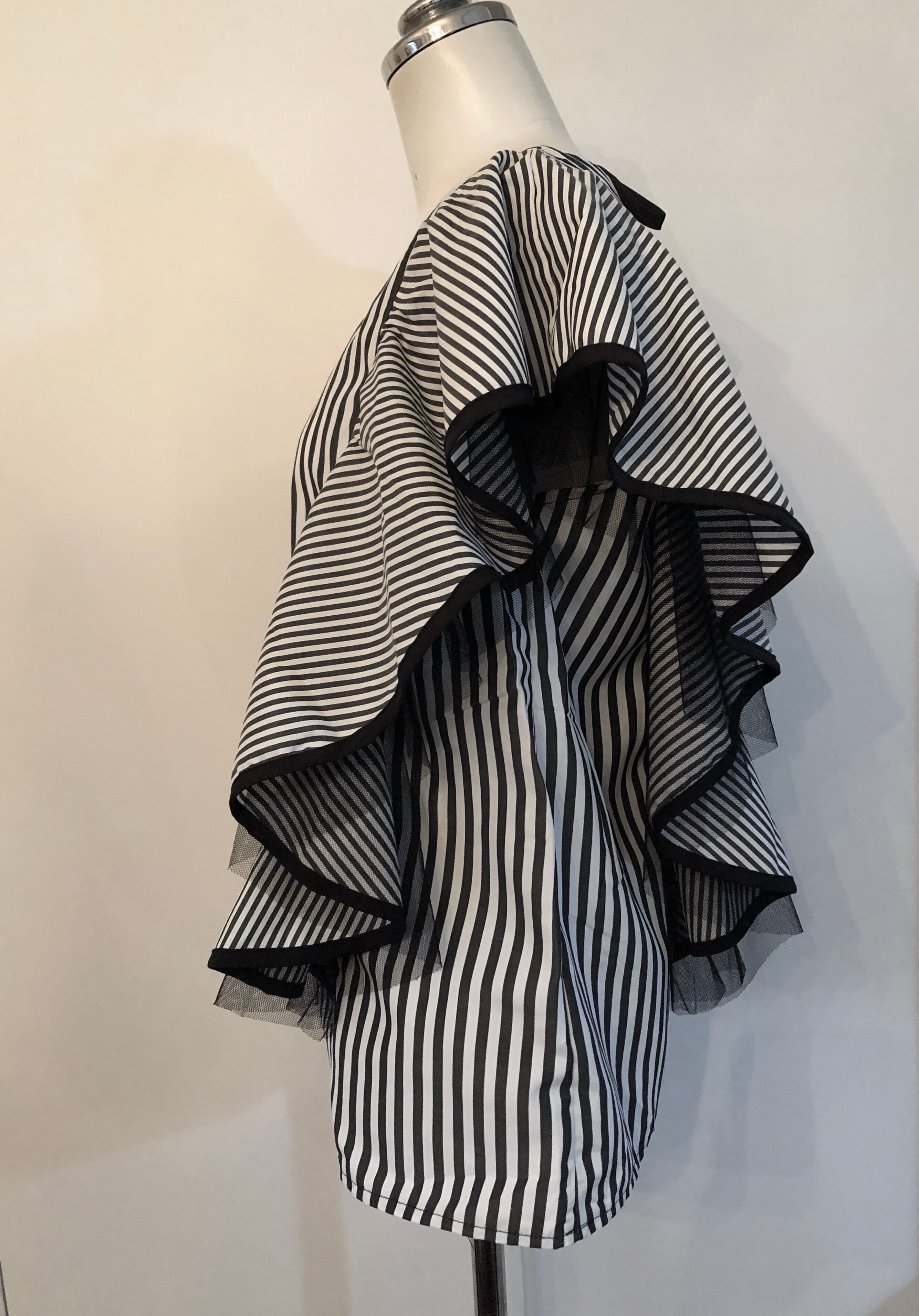 ダークグレーとホワイトのストライプが大人可愛いブラウスは