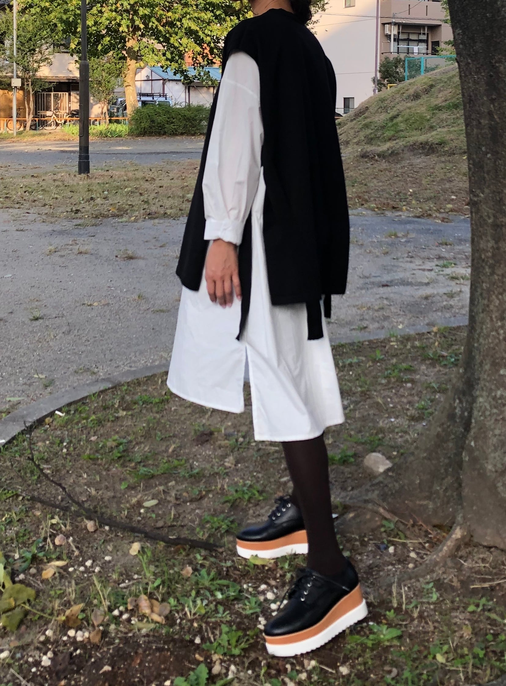 白シャツ+黒ニットワンピース