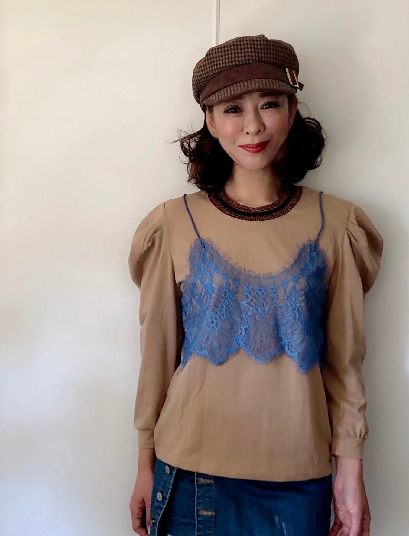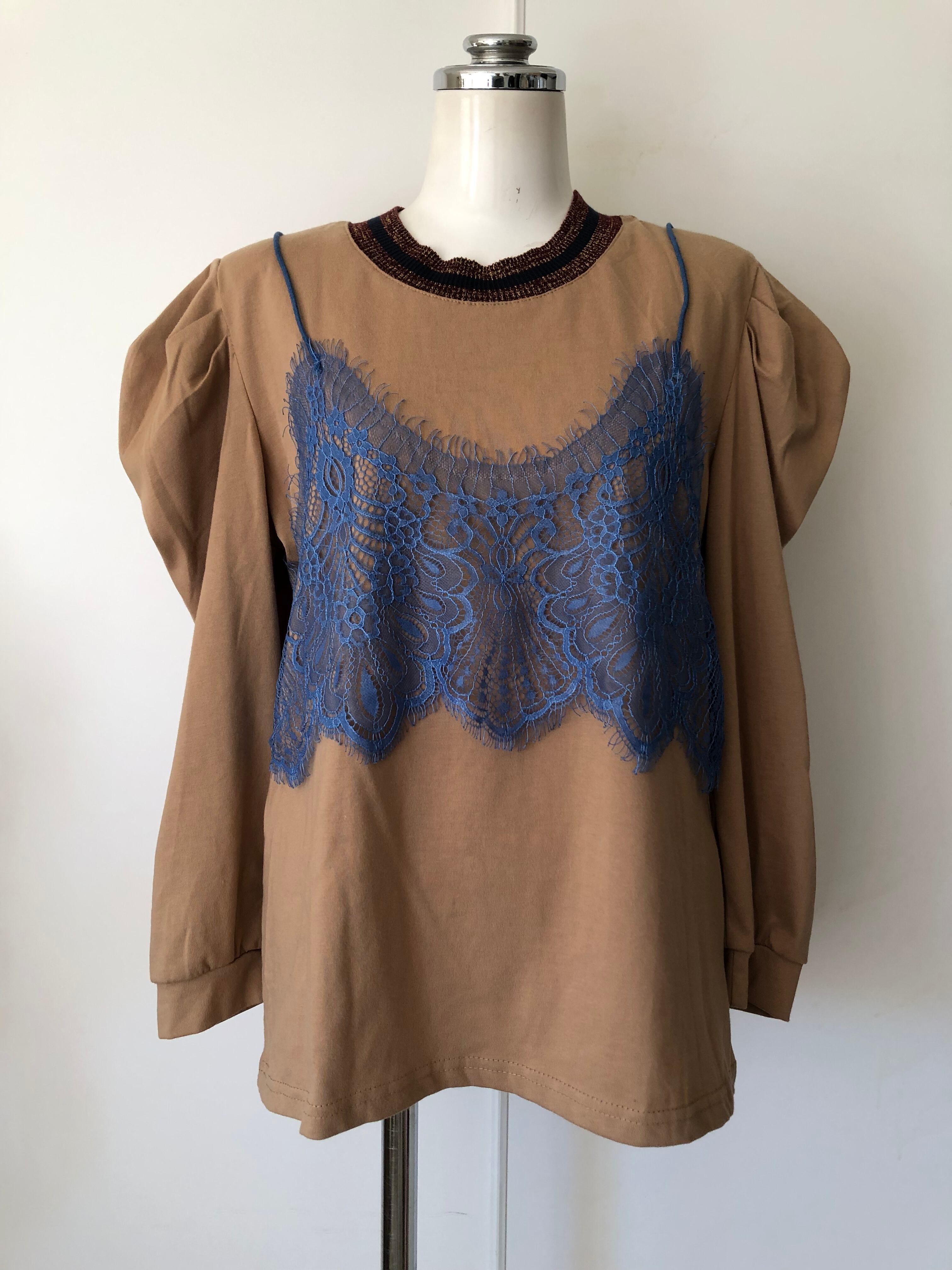 ダークベージュのロングtシャツにブルーのレースキャミが可愛いトップスです!