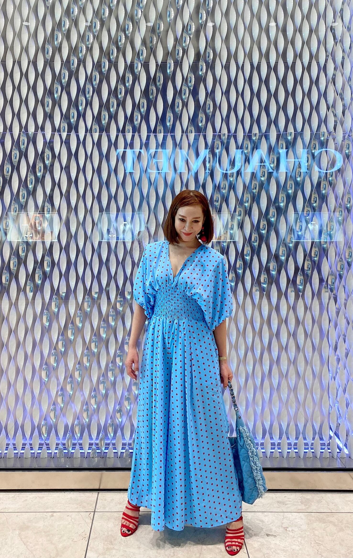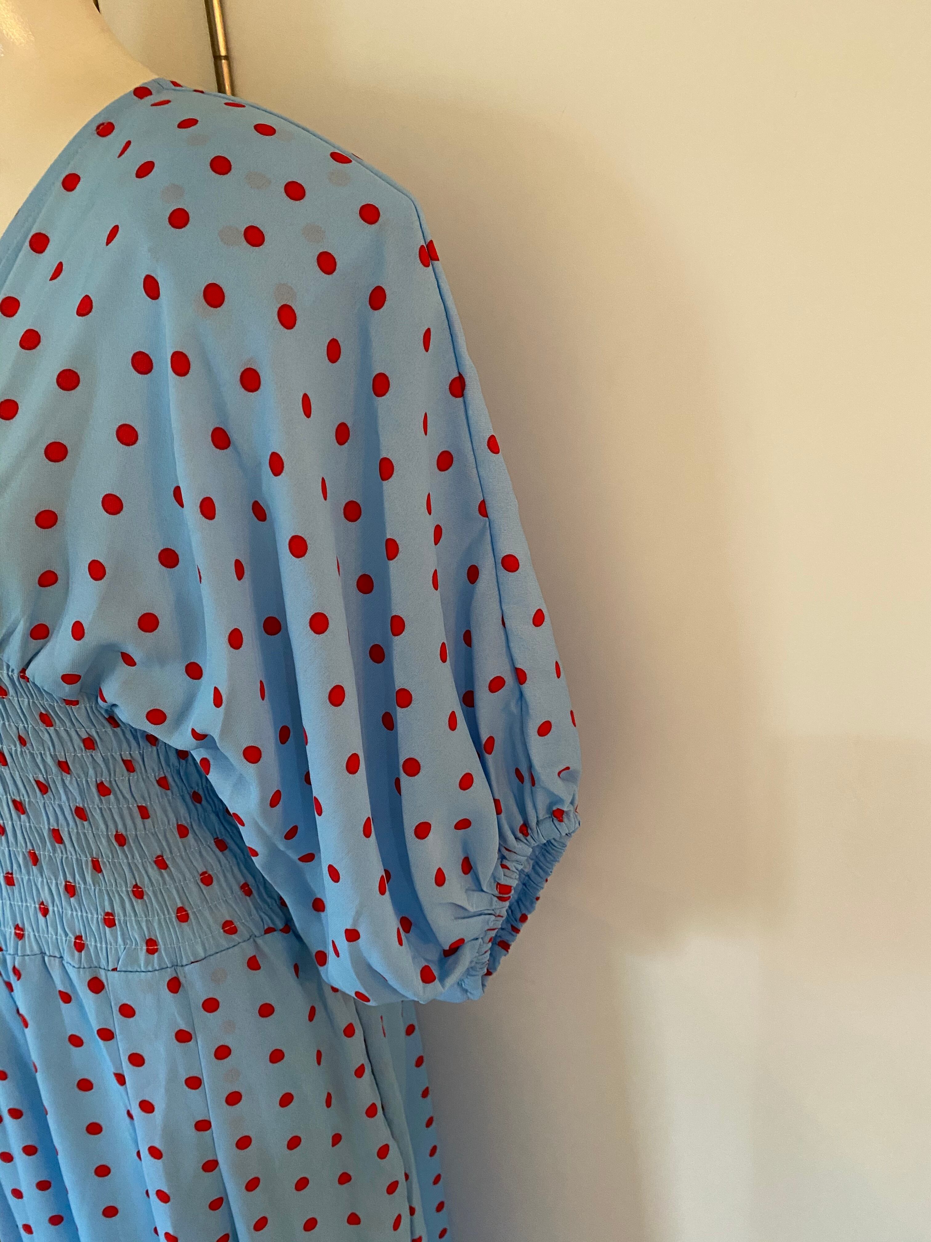 綺麗なブルー生地に赤ドットが可愛いオールインワンです!
