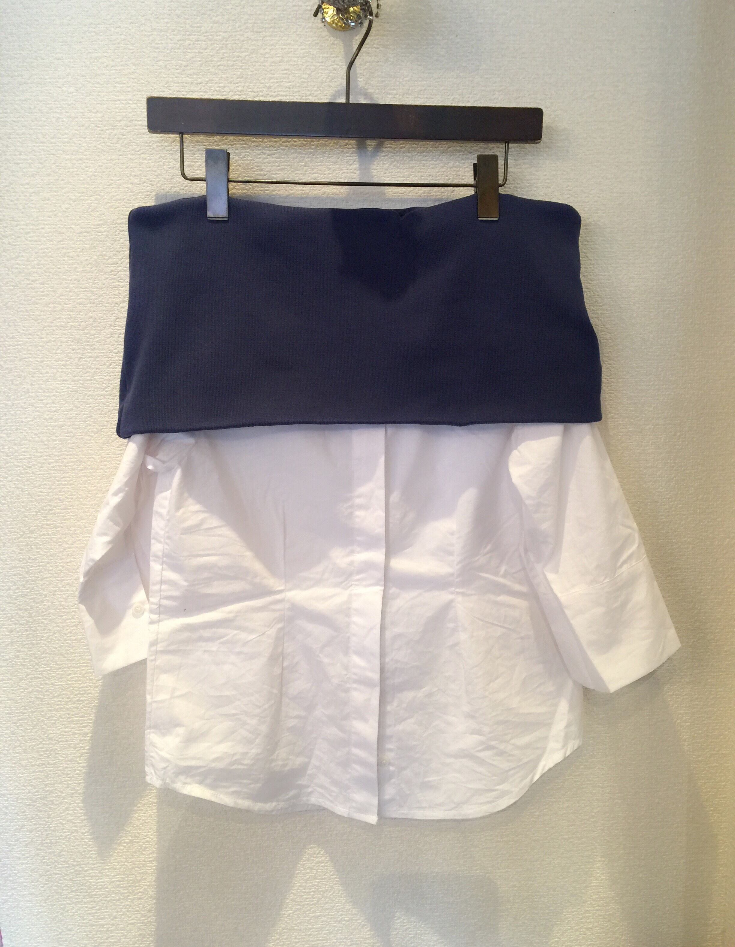 シャツにニットのオフショルダーが付いています。