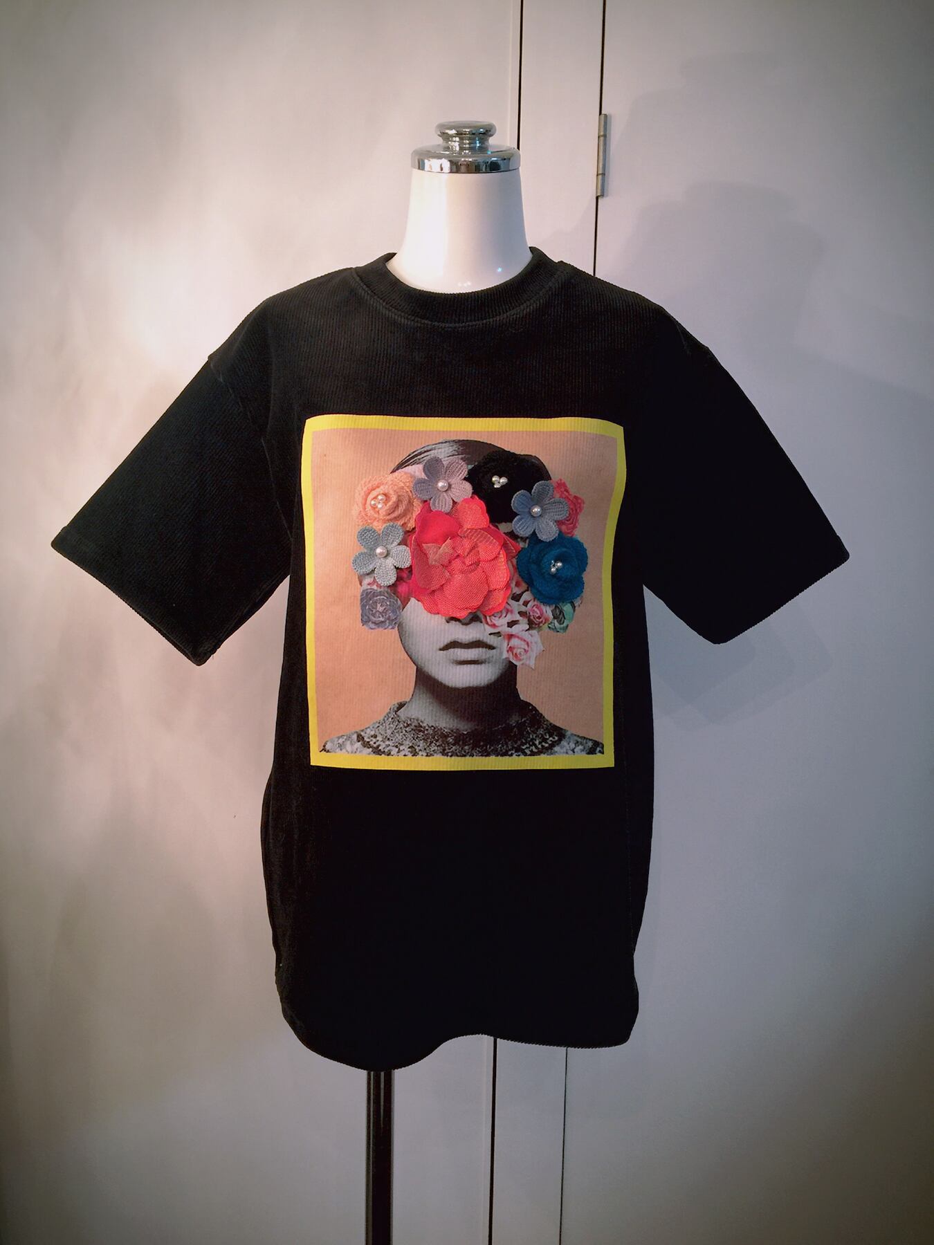 コーデュロイにデザイン性のあるプリントやニットフラワーが施された高級感溢れるトップスです。