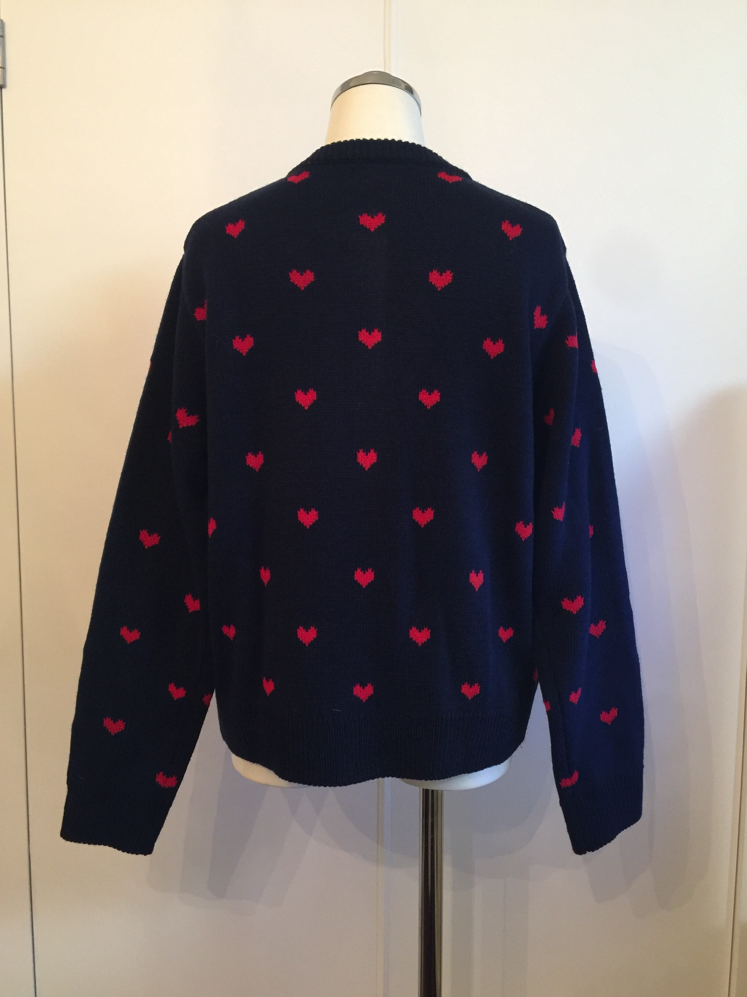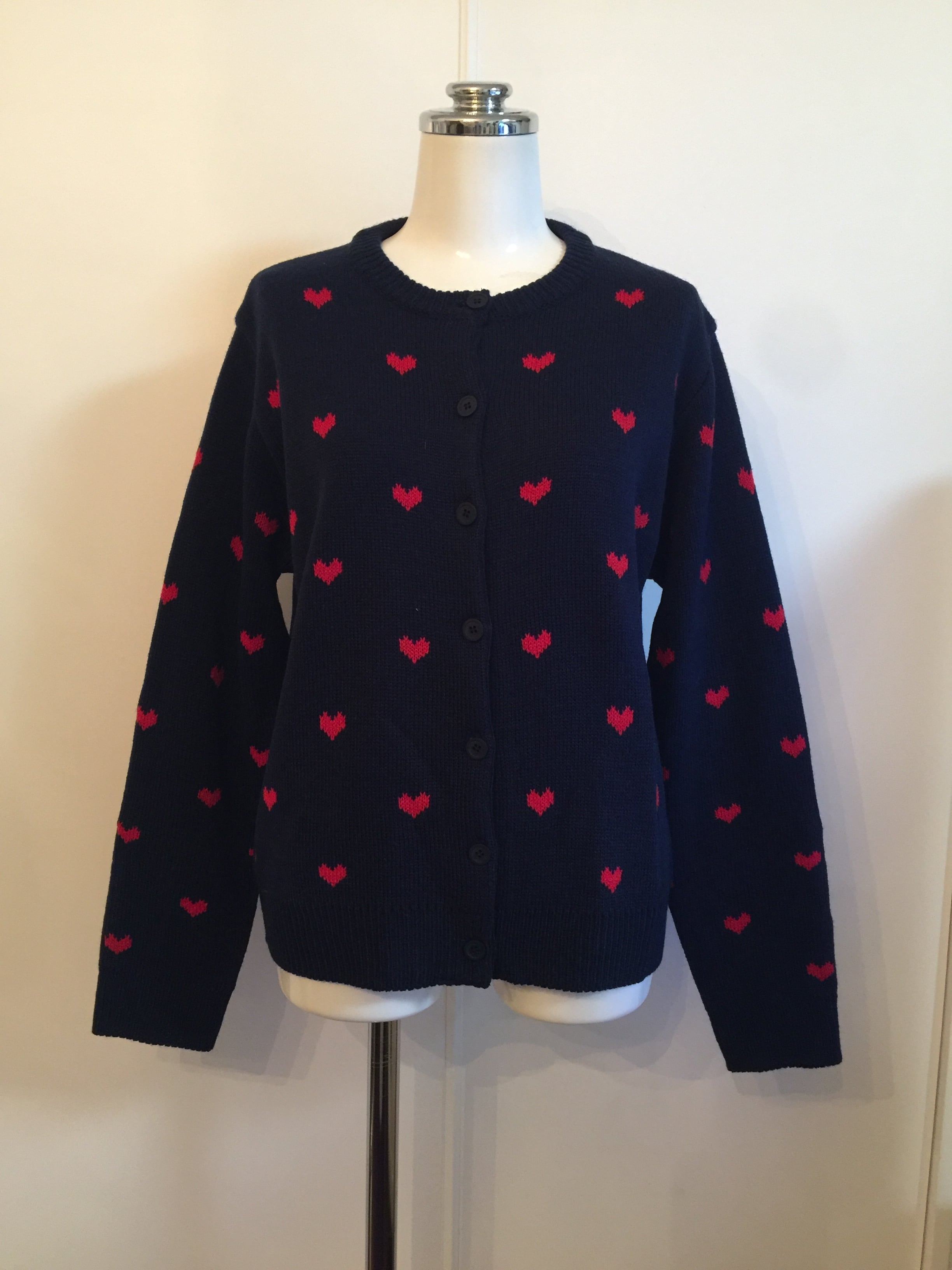 ネイビーに赤のハートが可愛いニットカーディガンです。